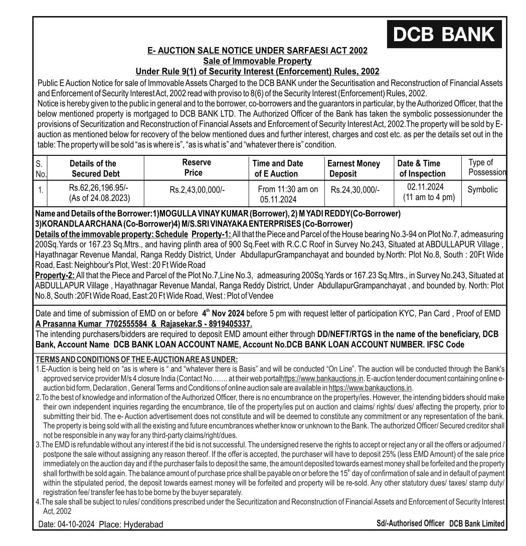 | Start Date and Time of Auction: | 05-11-2024 11:30 am |
