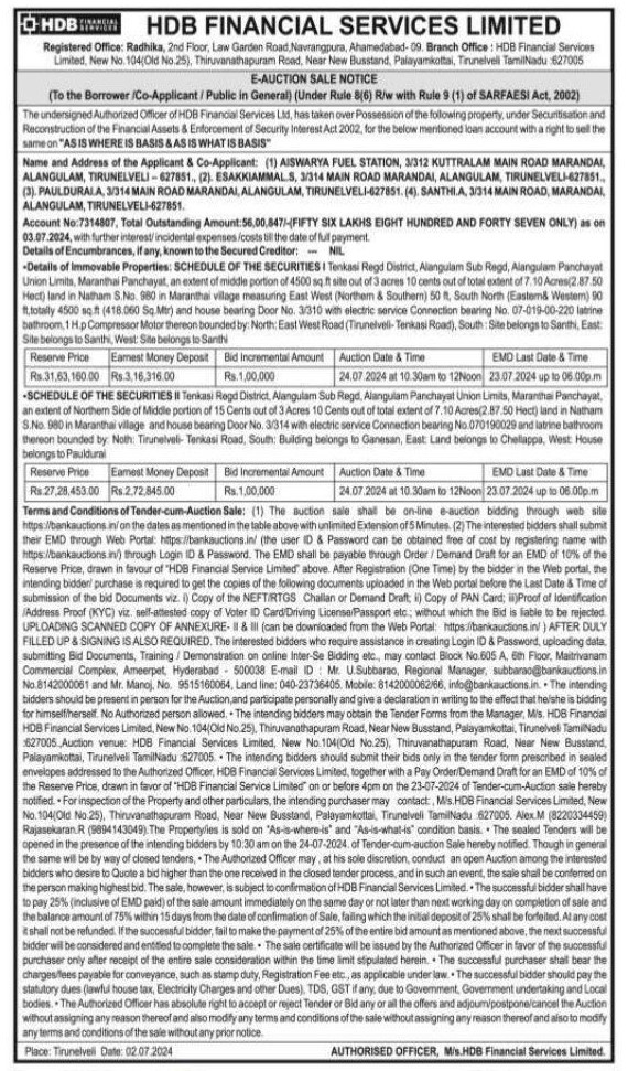 | Inspection Details: | For Inspection : Contact the Authorized Officer : Alex M 8220334459, Rajasekaran R 9894143049 |