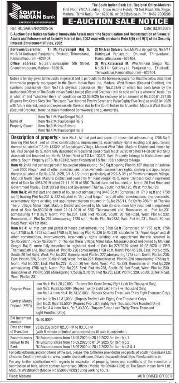 | Schedule of Property: | Description of property: Item No.1: All that part and parcel of house plot admeasuring 1708 Sq.ft bearing Plot No.4 and all other constructions, improvemerits, easementary rights existing and appurtenant thereon situated in T.S.No.1333/2 of Arapalayam Village, Madurai West Taluk, Madurai District and owned by Mr. Paul Sengol Raj S, more fully described in registered deed of Sale No.3102/2019 dated 14-08-2019 of SRO Arasaradi and bounded on, North: 33 feet Road at T.S.No. 1333/2, East: Property belongs to Nishnutheen and others, South: Property at T.S.No. 1333/2, West: Property at T.S.No. 1333/1 belongs to Nagu |