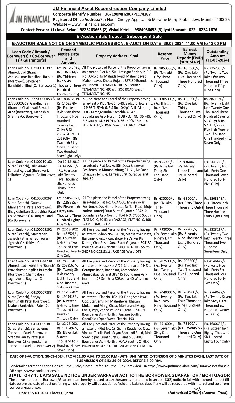 | Contact Details: | Contact The Authorized Officer: (1) Javal Belani- 9825263665 (2) Vishal Ketele -9584966653 (3) Jyoti Sawant - 022-6224 1676 |