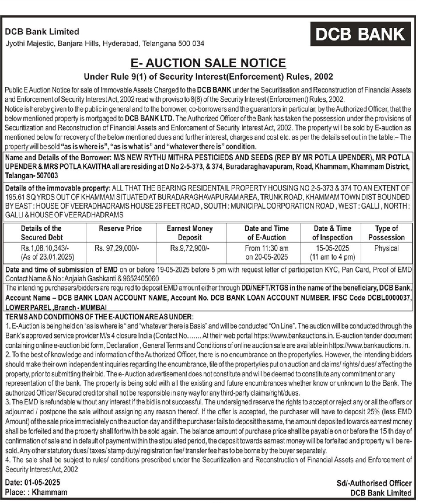 | Schedule of Property: | Details of the immovable property: ALL THAT THE BEARING RESIDENTAIL PROPERTY HOUSING NO 2-5-373 & 374 TO AN EXTENT OF 195.61 SQ YRDS OUT OF KHAMMAM SITUATED AT BURADARAGHAVAPURAMAREA TRUNK ROAD, KHAMMAM TOWN DIST BOUNDED BY EAST HOUSE OF VEERADHADRAMS HOUSE 26 FEET ROAD, SOUTH: MUNICIPAL CORPORATION ROAD, WEST: GALLI, NORTH: GALLI & HOUSE OF VEERADHADRAMS |