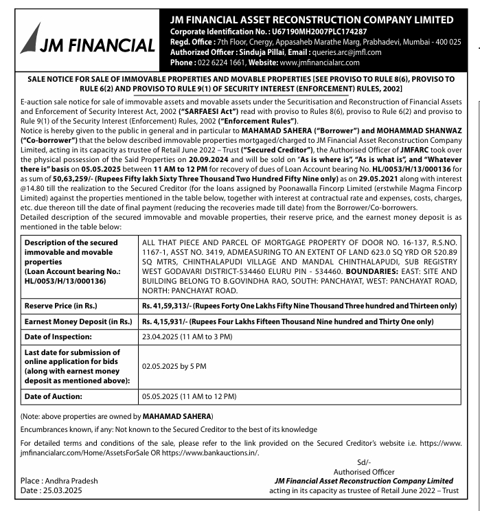 | Start Date and Time of Auction: | 05-05-2025 11:00 am |