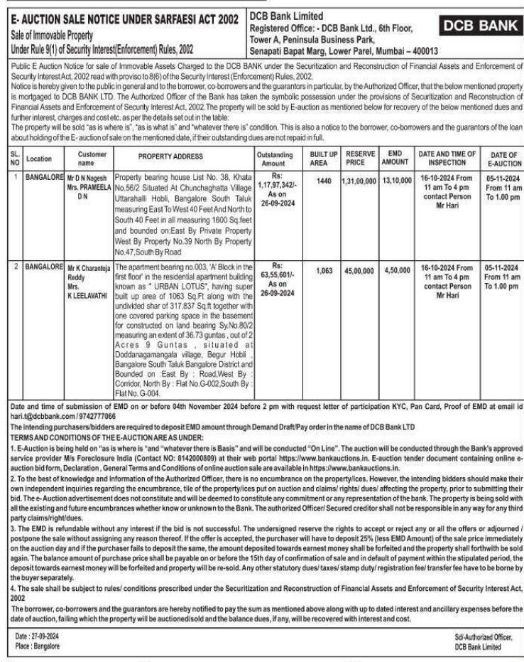 | Contact Details: | Contact The Authorized Officer : hari.t@dcbbank.com/ 9742777066 |