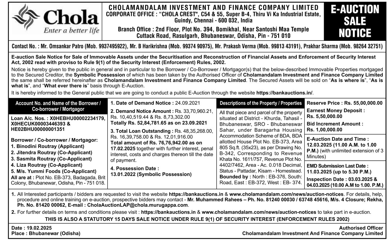 | Schedule of Property: | All that piece and parcel of the property situated at District - Khurda, Tahasil Bhubaneswar, SRO - Bhubaneswar Sahar, under Baragarha Housing Accommodation Scheme of BDA, BDA allotted House Plot No EB-373, Area 805 Sq ft. (35x23), as per Drawing No B-342, Corresponding to Revenue Khata No 1611/757, Revenue Plot No 4402/7462, Area Ac. 0.018 Decimal, Status Pattadar, -Homestead Bounded by North : EB-376, South: Road, East EB-372, West EB- 374. |