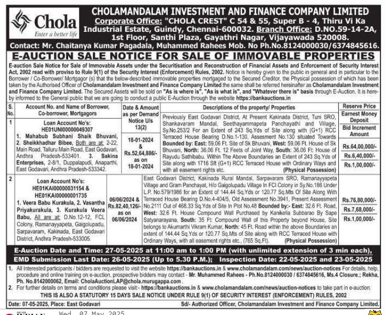 | Contact Details: | Contact The Authorized Officer :Mr. Chaitanya Kumar Pagadala, Muhammed Rahees Mob. No Ph.No.8124000030/6374845616. |