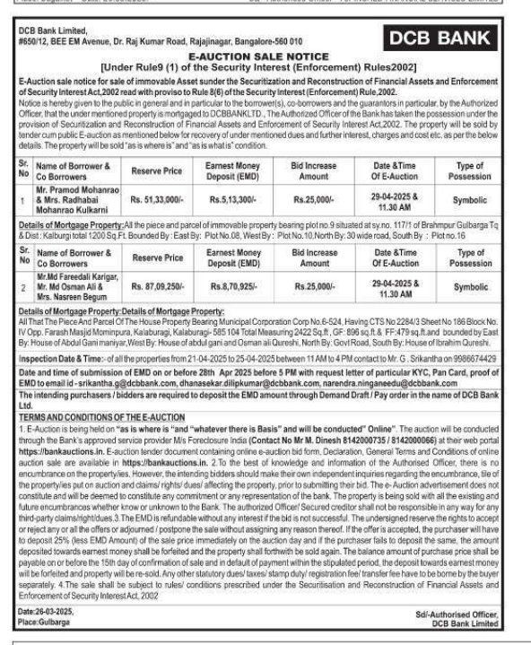 | End Date and Time of Auction: | 29-04-2025 12:30 pm |