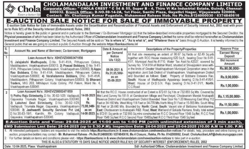 | Contact Details: | Contact The Authorized Officer : Mr Chaitanya Kumar Pagadala, Muhammed Rahees 8124000030, 6374845616 |