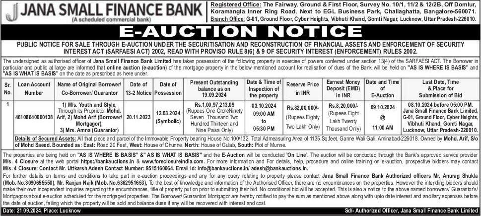 | Schedule of Property: | Details of Secured Assets: All that piece and parcel of the Immovable Property bearing House 100/132. Total Admeasuring Area of 1135 Sq.feet, Ganne Wali Gali, Aminabad-226018 Owned by Mohd. Arif, of Mohd Saeed. Bounded as: East: Road 20 Feet, West: House of Chunne, North: House of Gulab, South: Plot of Munne. |