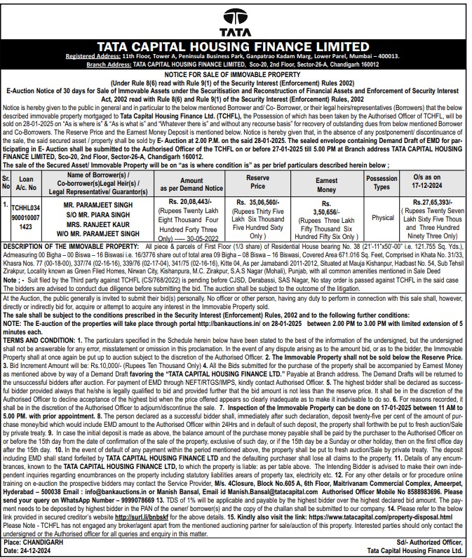 | Contact Details: | Contact The Authorized Officer: Manish Bansal, Email id Manish.Bansal@tatacapital.com 8588983696 / 9999078669 |