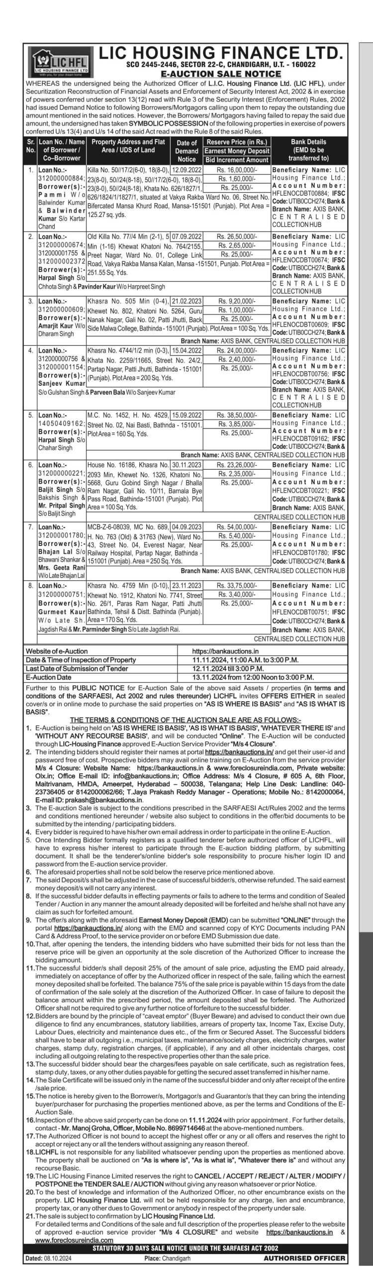 | End Date and Time of Auction: | 13-11-2024 3:00 pm |