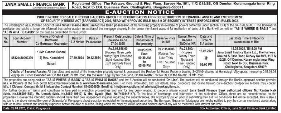 | Contact Details: | Contact The Authorized Officer : Mr. Ranjan Naik 6362951653, Mr Umesh 8050149617, Mrs Syeda 7400445147 |