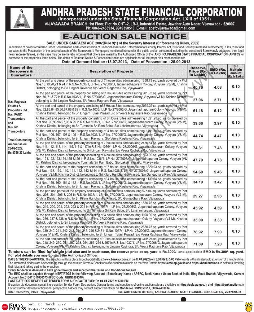 | Inspection Details: | For Inspection Details Contact The Authorized Officer- Mobile No. 9949358510, 0866-2463934 |