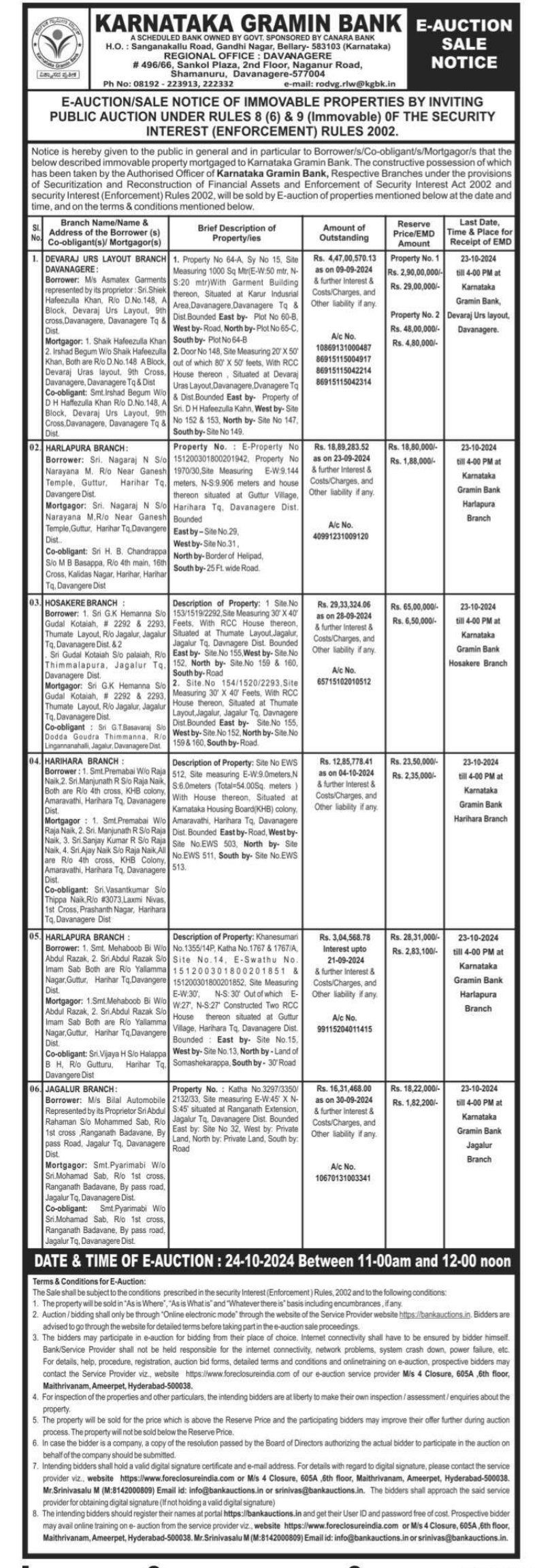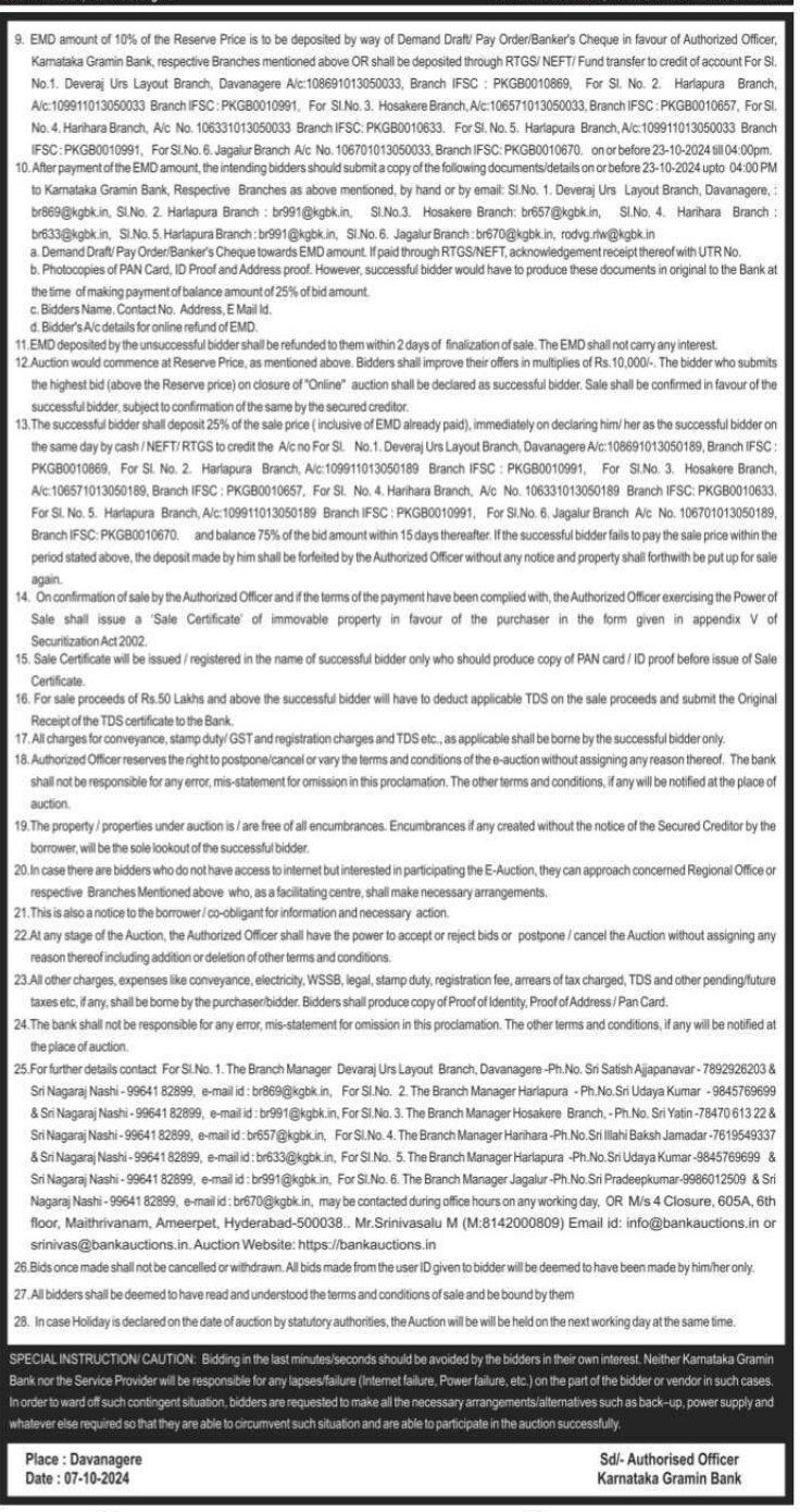 | Contact Details: | Contact The Authorized Officer: Sri Satish Ajjapanavar-7892926203 & Sri Nagaraj Nashi-99641 82899, e-mail id: br869@kgbk.in |