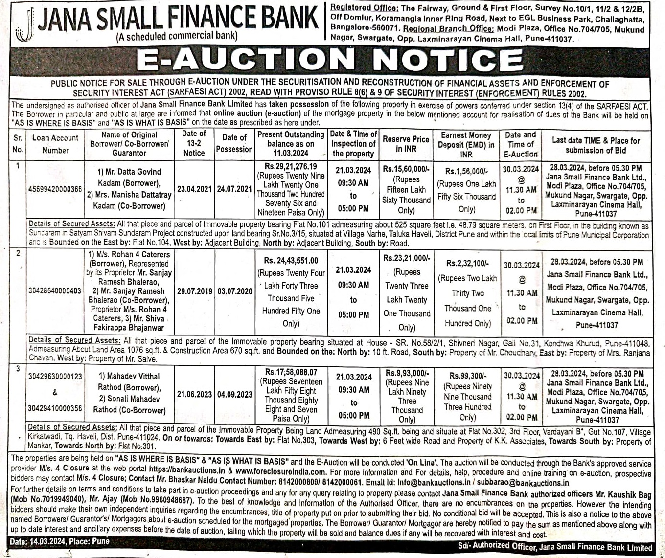 | Contact Details: | Contact Authorized Officer : Mr. Kaushik Bag (Mob No.7019949040). Mr. Ajay (Mob No.9960948687). |
