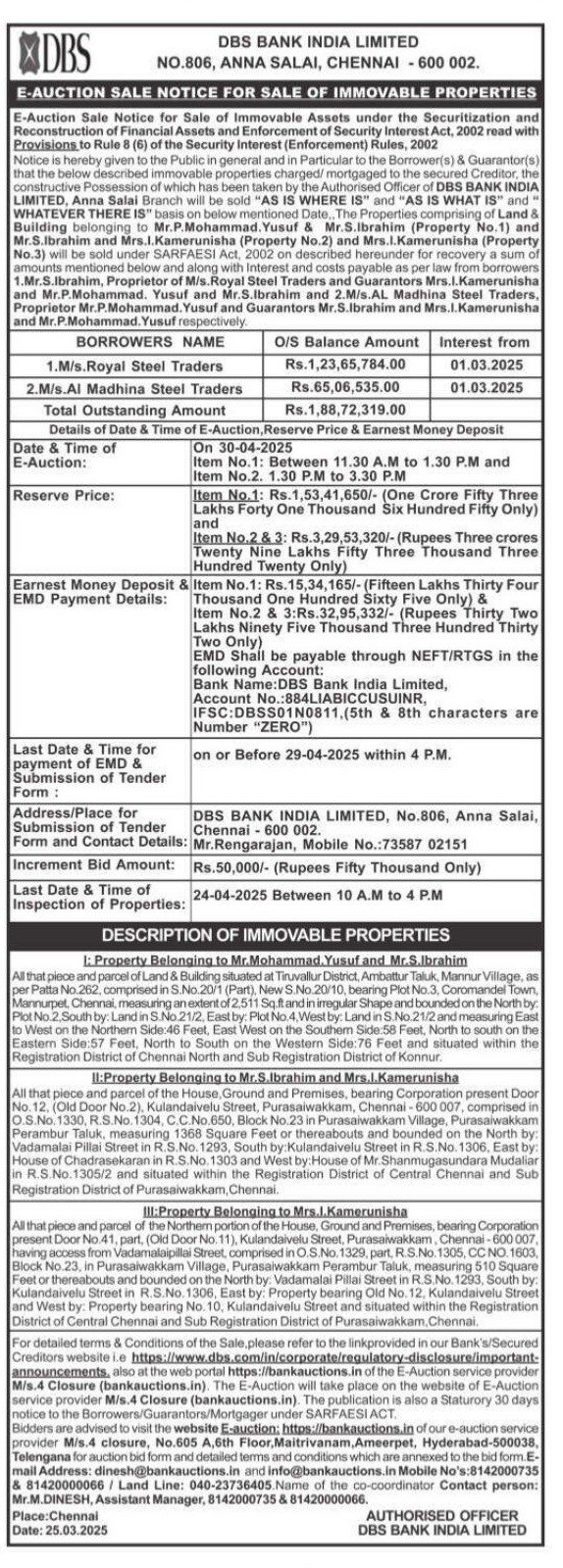 | Schedule of Property: | All that piece and parcel of the House Ground and Premises, bearing Corporation present Door No. 12. (Old Door No.2). Kulandaivelu Street, Purasaiwakkam, Chennai 600 007, comprised in O.S.No.1330.R.S.No.1304, C.C.No.650 Block No. 23 in Purasaiwakkam Village, Purasaiwakkam Perambur Taluk, measuring 1368 Square Feet or thereabouts and bounded on the North by Vadamalai Pillai Street in R.S.No.1293 South Kulandaivelu Street in R.S.No. 1306. East by: House of Chadrasekaran in R.S.No. 1303 and West by: House of Mr.Shanmugasundara Mudaliar in R.S.No.1305/2 and situated within the Registration District of Central Chennai and Sub Registration District of Purasaiwakkam, ChennaiAll that piece and parcel of the Northern portion of the House, Ground and Premises, bearing Corporation present Door No. 41, part, (Old Door No. 11), Kulandaivelu Street, Purasaiwakkam, Chennai 1-600 007 having access from Vadamalaipillai Street comprised in O.S. No. 1329, part, R.S.No. 1305, NO. 1603, Block No 23. in Purasaiwakkam Village, Purasaiwakkam Perambur Taluk, measuring 510 Square Feet or thereabouts and bounded on the North by: Vadamalai Pillai Street in R.S.N 1293, South by: Kulandaivelu Street in R.S.No.1306 East by: Property bearing Old No. 12. Kulandaivelu Street and West by: Property bearing No. 10. Kulandaivelu Street and situated within the Registration District of Central Chennai and Sub Registration District of Purasaiwakkam Chennai |