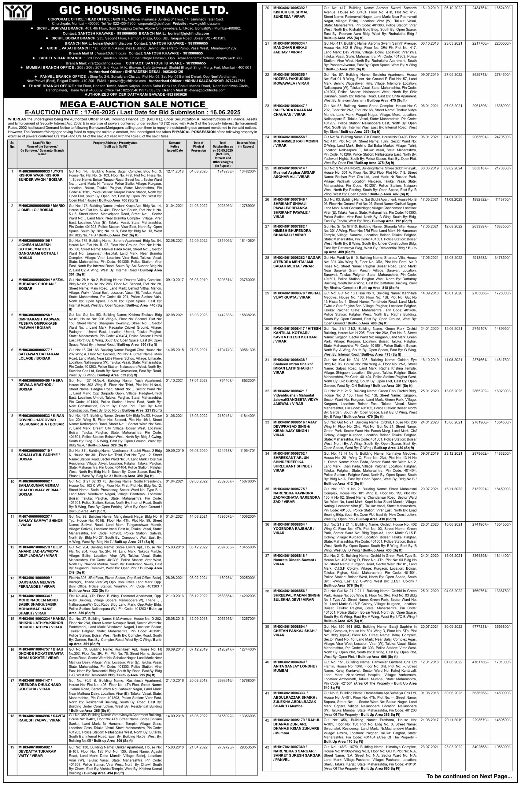 | Contact Details: | Contact The Authorized Officer : SANTOSH KHAVARE - 9819906655 |