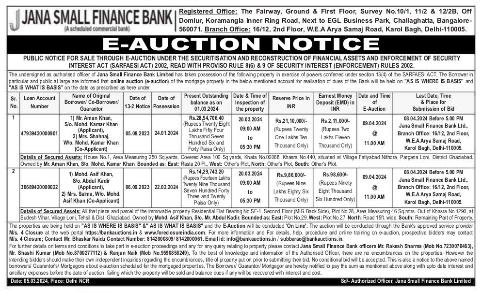 | Contact Details: | Contact Authorized Officer : Mr. Rakesh sharma Mob. No.:7230070463 , Mr. Shashi Kumar Mob.No.:8700277112 , Mr. Ranjan Naik Mob.No.:9590858249 |