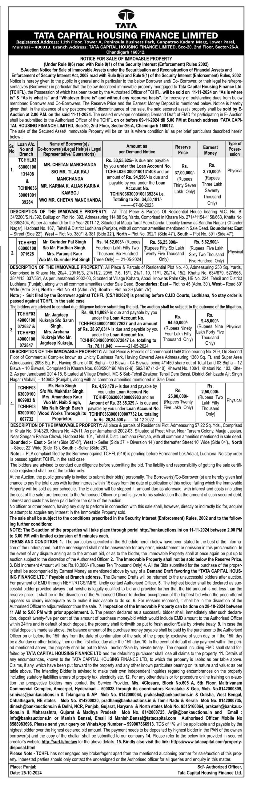| Contact Details: | Contact The Authorized Officer : Manish Bansal, Email id Manish.Bansal@tatacapital.com , 8588983696 / 9999078669 |