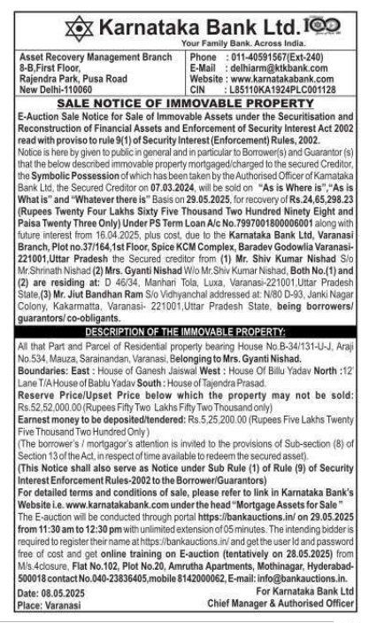 | Schedule of Property: | All that Part and Parcel of Residential property bearing House No B-34/131-U-J. Araji No. 534 Mauza, Sarainandan Varanasi, Belonging to Mrs. Gyanti Nishad.Boundaries: East : House of Ganesh Jaiswal West : House Of Billu Yadav North :12 Lane T/A House of Bablu Yadav South House of Tajendra Prasad |