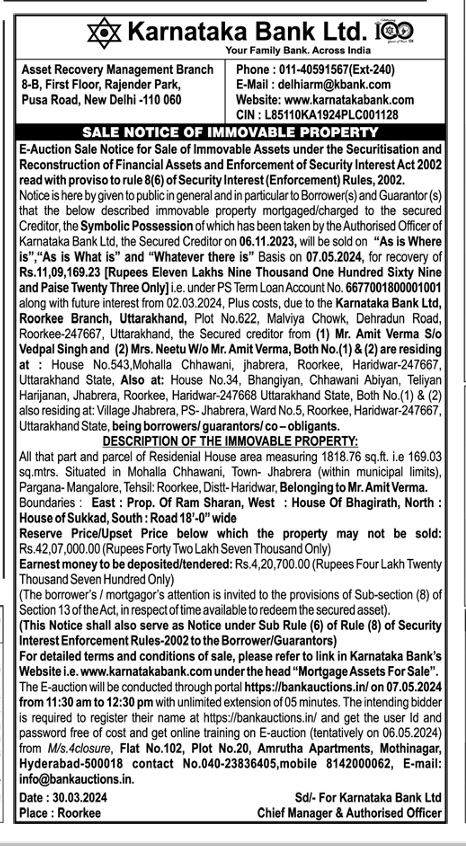 | Start Date and Time of Auction: | 07-05-2024 11:30 am |