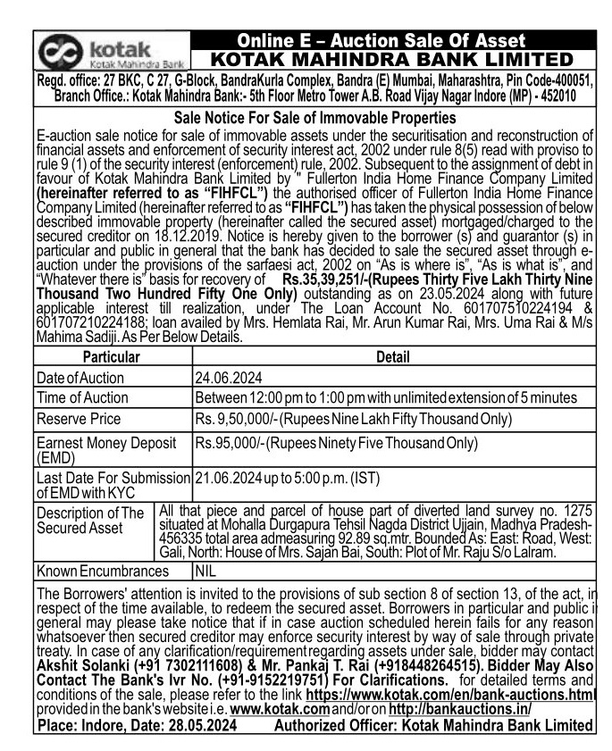 | Schedule of Property: | All that piece and parcel of house part of diverted land survey no. 1275 situated at Mohalla Durgapura Tehsil Nagda District Ujjain, Madhya Pradesh 456335 total area admeasuring 92.89 sq.mtr. Bounded As: East: Road, West: Gali, North: House of Mrs. Sajan Bai, South: Plot of Mr. Raju S/o Lalram. |