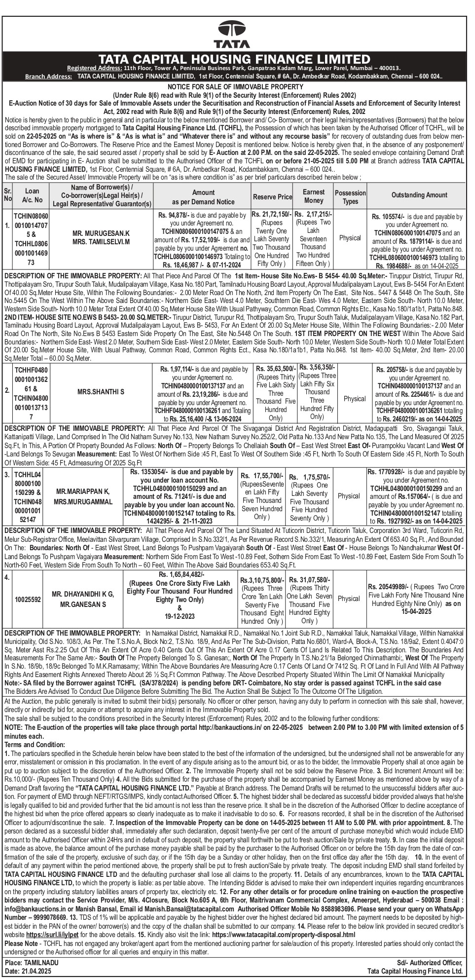 | Schedule of Property: | All That Piece And Parcel Of The 1st Item- House Site No.Ews- B 5454- 40.00 Sq.Meter:- Tiruppur District, Tirupur Rd, Thottipalayam Sro, Tirupur South Taluk, Mudalipalayam Village, Kasa No.180 Part, Tamilnadu Housing Board Layout, Approval Mudalipalayam Layout, Ews B- 5454 For An Extent Of 40.00 Sq.Meter House Site, Within The Following Boundaries:- 2.00 Meter Road On The North, 2nd Item Property On The East, Site Nos.. 5447 & 5448 On The South, Site No.5445 On The West Within The Above Said Boundaries:- Northern Side East- West 4.0 Meter, Southtern Die East- Wes 4.0 Meter, Eastern Side South- North 10.0 Meter, Western Side South- North 10.0 Meter Total Extent Of 40.00 Sq.Meter House Site With Usual Pathyway, Common Road, Common Rights Etc., Kasa No.180/1a1b1, Patta No.848. 2ND ITEM- HOUSE SITE NO.EWS B 5453- 20.00 SQ.METER:- Tirupur District, Turupur Rd, Thottipalayam Sro, Tirupur South Taluk, Mudalipalayyam Village, Kasa No.182 Part, Tamilnadu Housing Board Layout, Approval Mudalipalayam Layout, Ews B- 5453, For An Extent Of 20.00 Sq.Meter House Site, Within The Following Boundaries:- 2.00 Meter (Full details available in sale notice) |