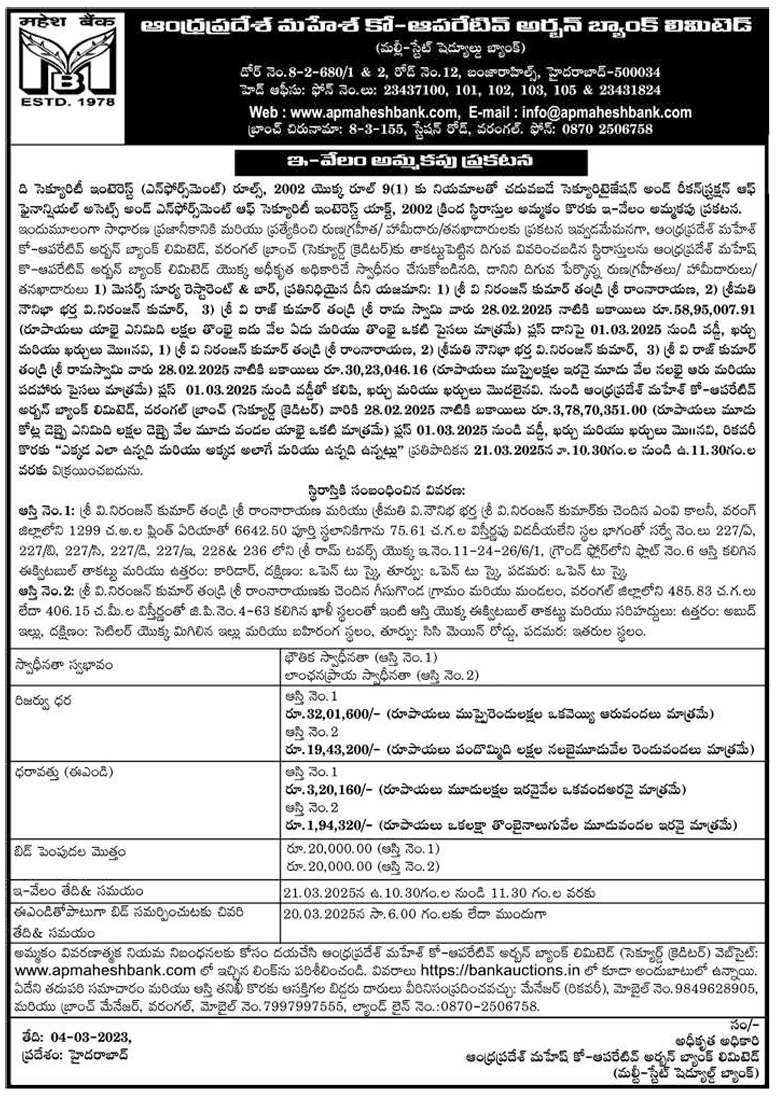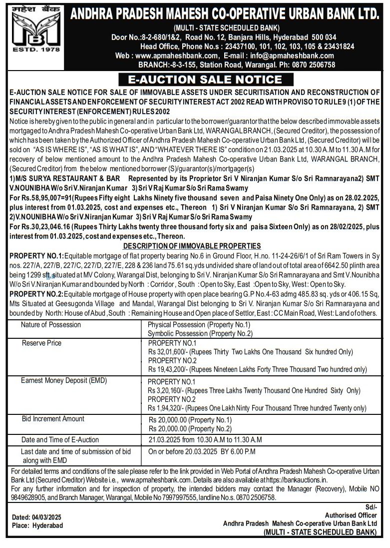 | Schedule of Property: | PROPERTY NO.1: Equitable mortgage of flat property bearing No.6 in Ground Floor, H.no. 11-24-26/6/1 of Sri Ram Towers in Sy nos. 227/A, 227/B, 227/C, 227/D, 227/E, 228 & 236 land 75.61 sq.yds undivided share of land out of total area of 6642.50 plinth area being 1299 sft, situated at MV Colony, Warangal Dist, belonging to Sri V. Niranjan Kumar S/o Sri Ramnarayana and Smt V.Nounibha W/o Sri V.Niranjan Kumar and bounded by North: Corridor, South: Open to Sky, East: Open to Sky, West: Open to Sky |