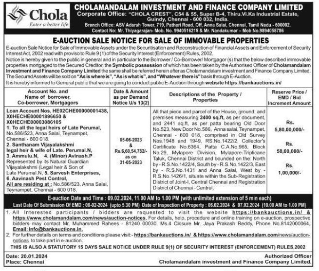| Contact Details: | Contact the Authorized Officer : Muhammed Rahees - 8124000030, Mr. Thiyagarajan- Mob. No. 9940516215, Mr. Nandakumar - Mob No.9894058786. |