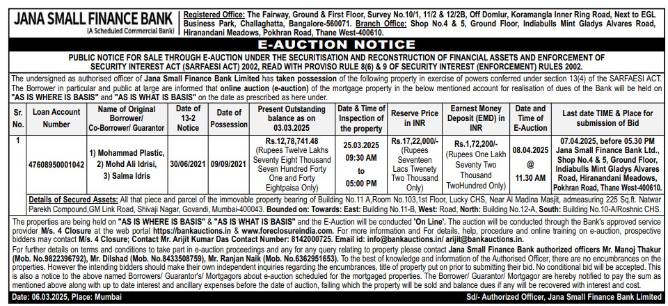 | Start Date and Time of Auction: | 08-04-2025 11:30 am |