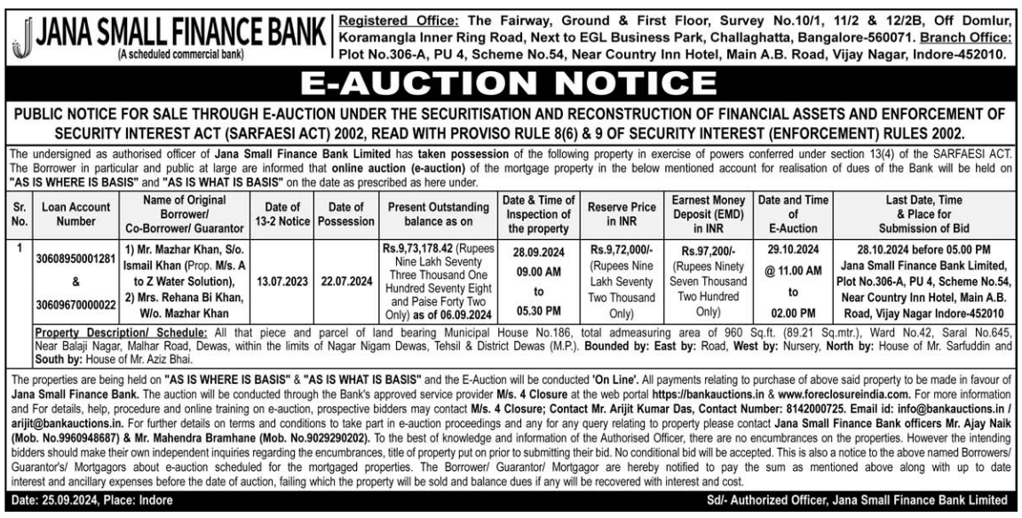 | Schedule of Property: | All that piece and parcel of land bearing Municipal House No.186, total admeasuring area of 960 Sq.ft. (89.21 Sq.mtr.), Ward No.42, Saral No.645 Near Balaji Nagar, Malhar Road, Dewas, within the limits of Nagar Nigam Dewas, Tehsil & District Dewas (M.P.). Bounded by: East by: Road, West by: Nursery, North by: House of Mr. Sarfuddin and South by: House of Mr. Aziz Bhai. |