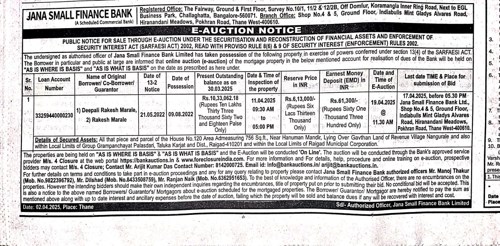 | Contact Details: | Contact The Authorized Officer : Mr. Manoj Thakur 9822396792, Mr. Dilshad 8433508759, Mr. Ranjan Naik 6362951653 |