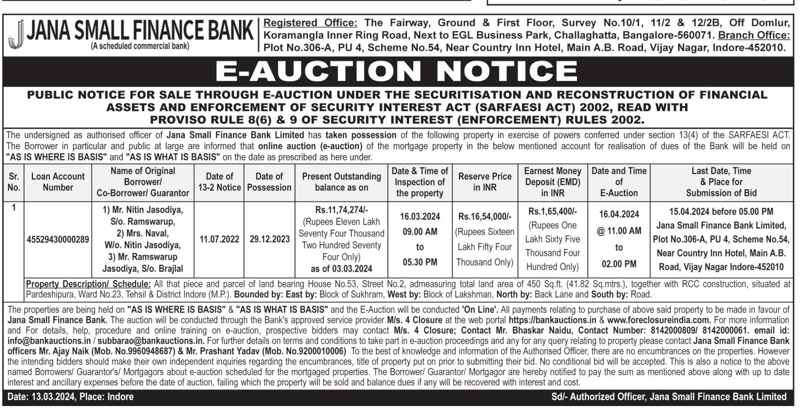 | Schedule of Property: | All that piece and parcel of land bearing House No.53, Street No.2, admeasuring total land area of 450 Sq.ft. (41.82 Sq.mtrs.), together with RCC construction, situated Pardeshipura, Ward No.23, Tehsil & District Indore (M.P.). Bounded by: East by: Block of Sukhram, West by: Block of Lakshman, North by: Back Lane and South by: Road. |