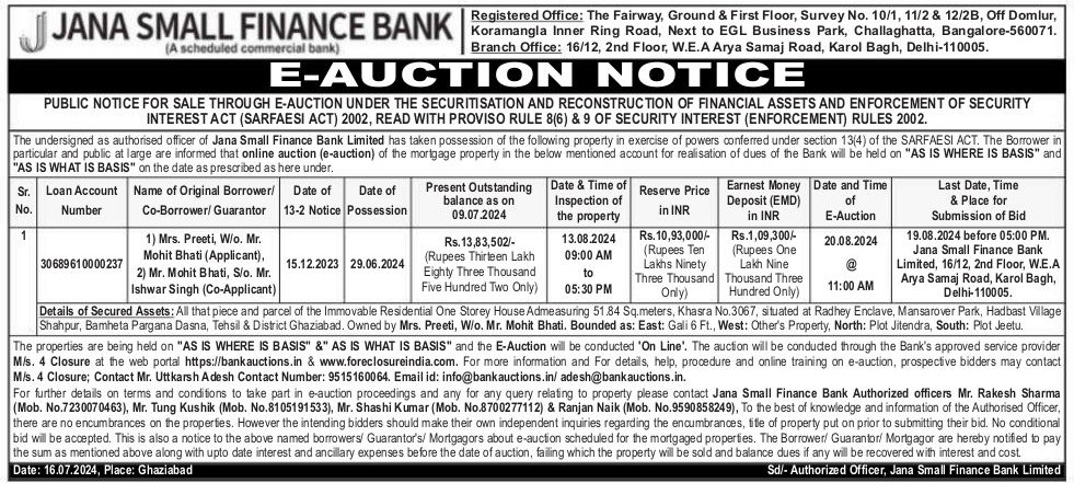 | Schedule of Property: | All that piece and parcel of the Immovable Residential One Storey House Admeasuring 51.84 Sq.meters, Khasra No.3067, situated at Radhey Enclave, Mansarover Park, Hadbast Village Shahpur, Bamheta Pargana Dasna, Tehsil & District Ghaziabad. Owned by Mrs. Preeti, W/o. Mr. Mohit Bhati. Bounded as: East: Gali 6 Ft., West: Other's Property, North: Plot Jitendra, South: Plot Jeetu. |