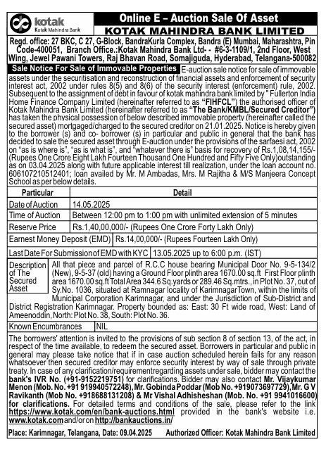 | Contact Details: | Contact The Authorized Officer: 919552219751/ Mr Vijaykumar Menon : 9940572248/ Mr Gobinda Poddar 9073697729/ Mr GV Ravikanth : 8688131208 Mr Vishal Adhisheshan : 9941016600 |