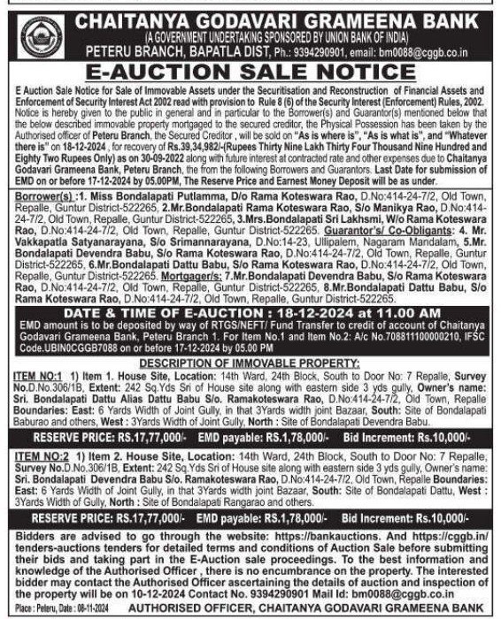 | Schedule of Property: | ITEM NO:1 1) Item 1. House Site, Location: 14th Ward, 24th Block, South to Door No: 7 Repalle, Survey No.D.No.306/1B, Extent 242 Sq Yds Sri of House site along with eastern side 3 yds gully, Owner's name: Sri. Bondalapati Dattu Alias Dattu Babu S/o. Ramakoteswara Rao, D.No:414-24-7/2. Old Town, Repalle Boundaries: East: 6 Yards Width of Joint Gully. in that 3Yards width joint Bazaar, South: Site of Bondalapati Baburao and others, West 3Yards Width of Joint Gully, North Site of Bondalapati Devendra Babu. |
