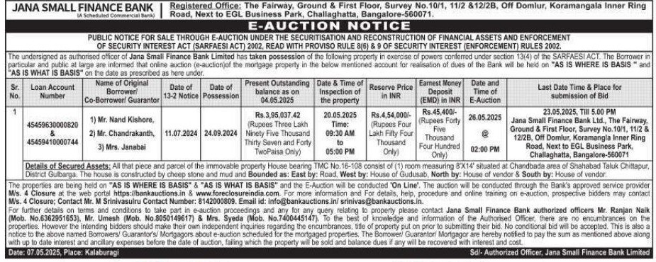 | End Date and Time of Auction: | 26-05-2025 3:00 pm |