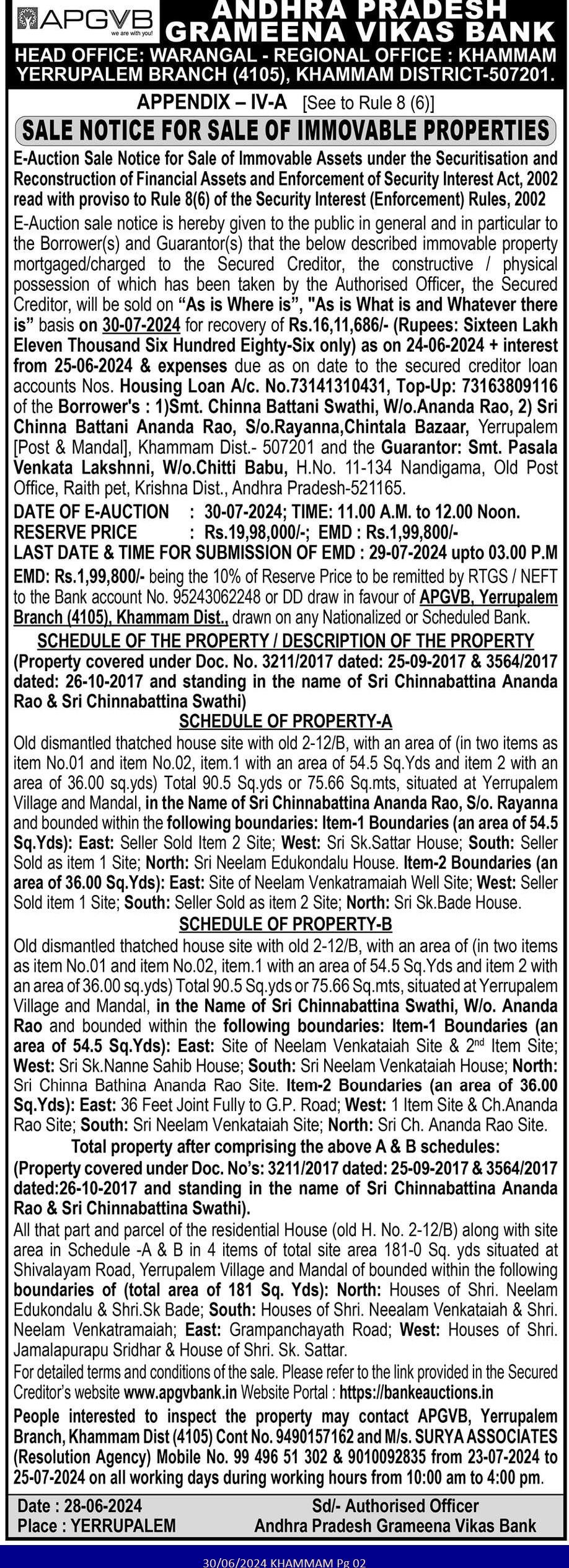 | Schedule of Property: | SCHEDULE OF PROPERTY-A Old dismantled thatched house site with old 2-12/B, with an area of (in two items as item No.01 and item No.02, item. 1 with an area of 54.5 Sq. Yds and item 2 with an area of 36.00 sq.yds) Total 90.5 Sq.yds or 75.66 Sq.mts, situated at Yerrupalem Village and Mandal, in the Name of Sri Chinnabattina Ananda Rao, S/o. Rayanna and bounded within the following boundaries: Item-1 Boundaries (an area of 54.5 Sq.Yds): East: Seller Sold Item 2 Site; West: Sri Sk.Sattar House; South: Seller Sold as item 1 Site; North: Sri Neelam Edukondalu House. Item-2 Boundaries (an area of 36.00 Sq. Yds): East: Site of Neelam Venkatramaiah Well Site; West: Seller Sold item 1 Site; South: Seller Sold as item 2 Site; North: Sri Sk. Bade House.SCHEDULE OF PROPERTY-BOld dismantled thatched house site with old 2-12/B, with an area of (in two items as item No.01 and item No.02, (Full details available in sale notice) |