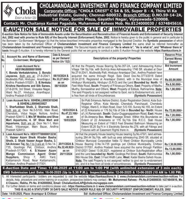 | Contact Details: | Contact The Authorized Officer ;Mr. Chaitanya Kumar Pagadala, Muhammed Rahees 8124000030 6374845616. |