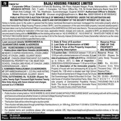 | Contact Details: | Contact The Authorized Officer : Bhuwan Singh, Email ID: bhowan.singh@bajajfinserv.in, Mob No. 8669189048 & 9818606402 |