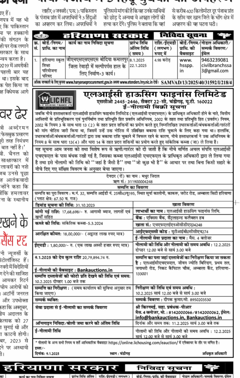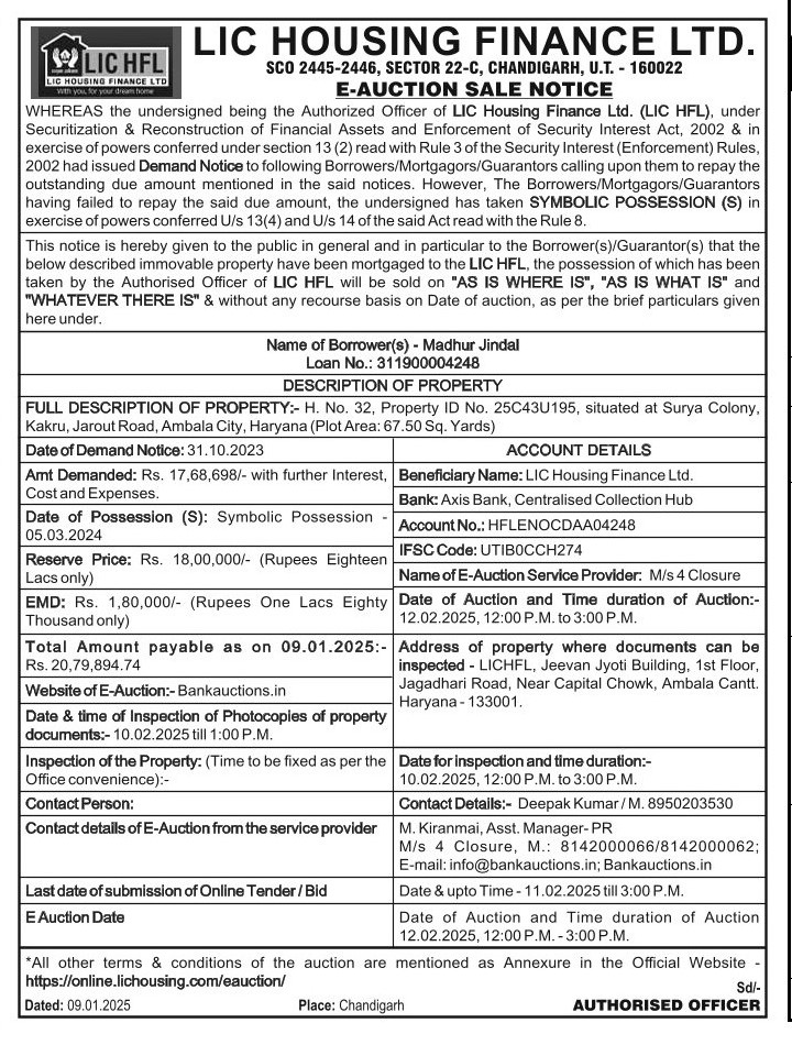 | Schedule of Property: | H. No. 32, Property ID No. 25C43U195, situated at Surya Colony. Kakru, Jarout Road, Ambala City, Haryana (Plot Area: 67.50 Sq. Yards) |