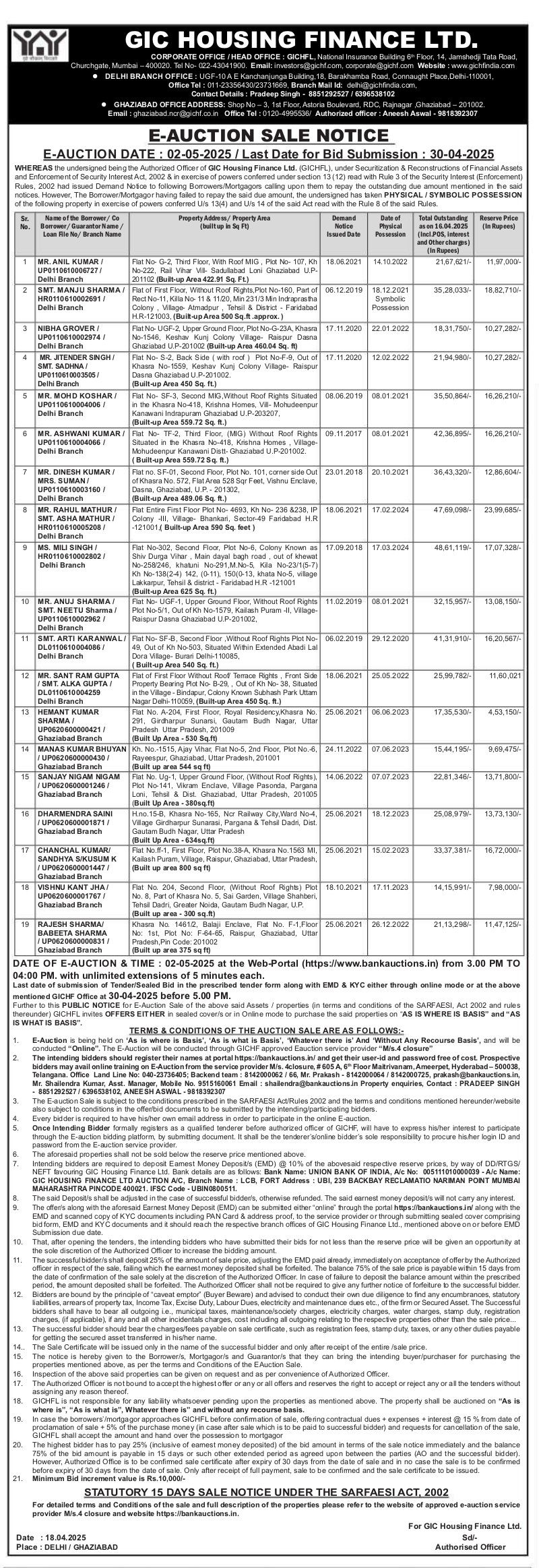 | Contact Details: | Contact The Authorized Officer: Email ghaziabad.ncr@gichf.co.in 0120-4995536/ Aneesh Aswal - 9818392307 |