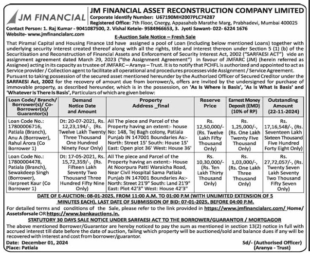 | Contact Details: | Contact The Authorized Officer: 1. Raj Kumar-9041087500, 2. Vishal Ketele- 9584966653, 3. Jyoti Sawant-022-6224 1676 Website-www.jmfinancialarc.com |