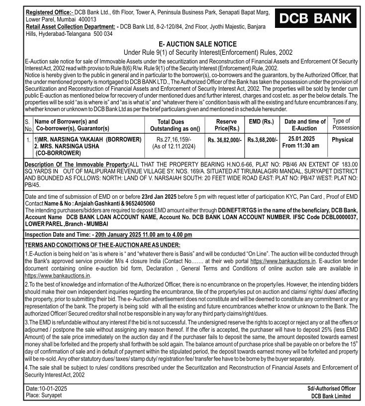 | Schedule of Property: | ALL THAT THE PROPERTY BEARING H.NO.6-66, PLAT NO: PB/46 AN EXTENT OF 183.00 SQ.YARDS IN OUT OF MALIPURAM REVENUE VILLAGE SY. NOS. 169/A. SITUATED AT TIRUMALAGIRI MANDAL, SURYAPET DISTRICT AND BOUNDED AS FOLLOWS: NORTH: LAND OF V. NARSAIAH SOUTH: 20 FEET WIDE ROAD EAST: PLAT NO: PB/47 WEST: PLAT NO: PB/45. |