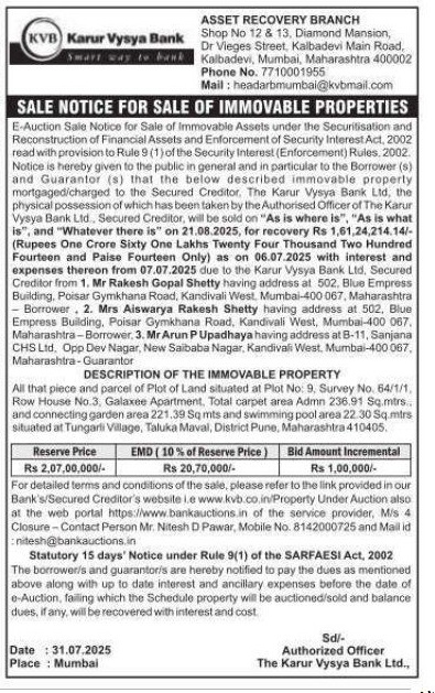 | End Date and Time of Auction: | 21-08-2025 12:00 pm |