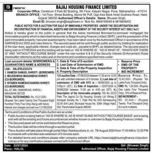 | Schedule of Property: | Description of the immovable property: RS No 223/3 Paiki The Jagruti Co Op Housing Society Ltd Vibhag E Amrapali Society No 1, Paiki Plot No 55/3 Admeasuring 52.04 Smt Land. Municpal House No. 9384 Village Haloi,Dist Panchmahal Gujarat-389350 |