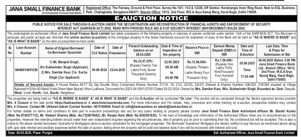 | Schedule of Property: | A House Rakba 49.77 Sq Gaj Double Story Comprised Khasra Number 21//18, 19, 21/2, 22//25, 24/2/1 Khewat & Khatoni Number 336/325, 318/346 situated at Village Kakowal H.B No. 80 Abadi Vivek Dham Near Bajranj Vihar Ludhiana. Document No.2023-24/106/1/27051 Dated 20-02-2024. Owned by Mrs. Samitar Kaur, W/o, Sukhwinder Singh, Bounded as: East: Deepak, West: Vivek, North: Gali, South: Neighbour |