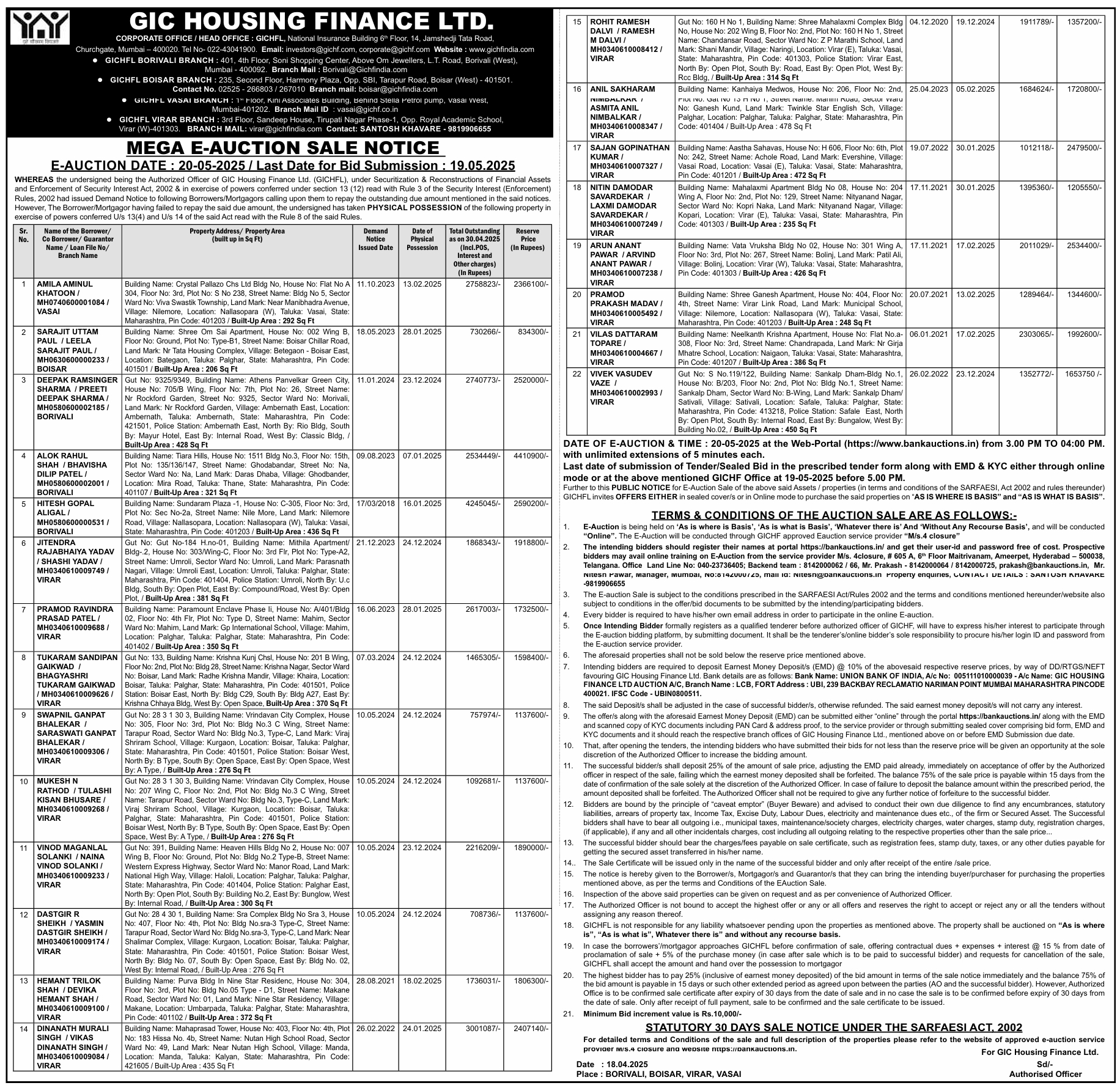 | Contact Details: | Contact The Authorized Officer:SANTOSH KHAVARE 9819906655 |