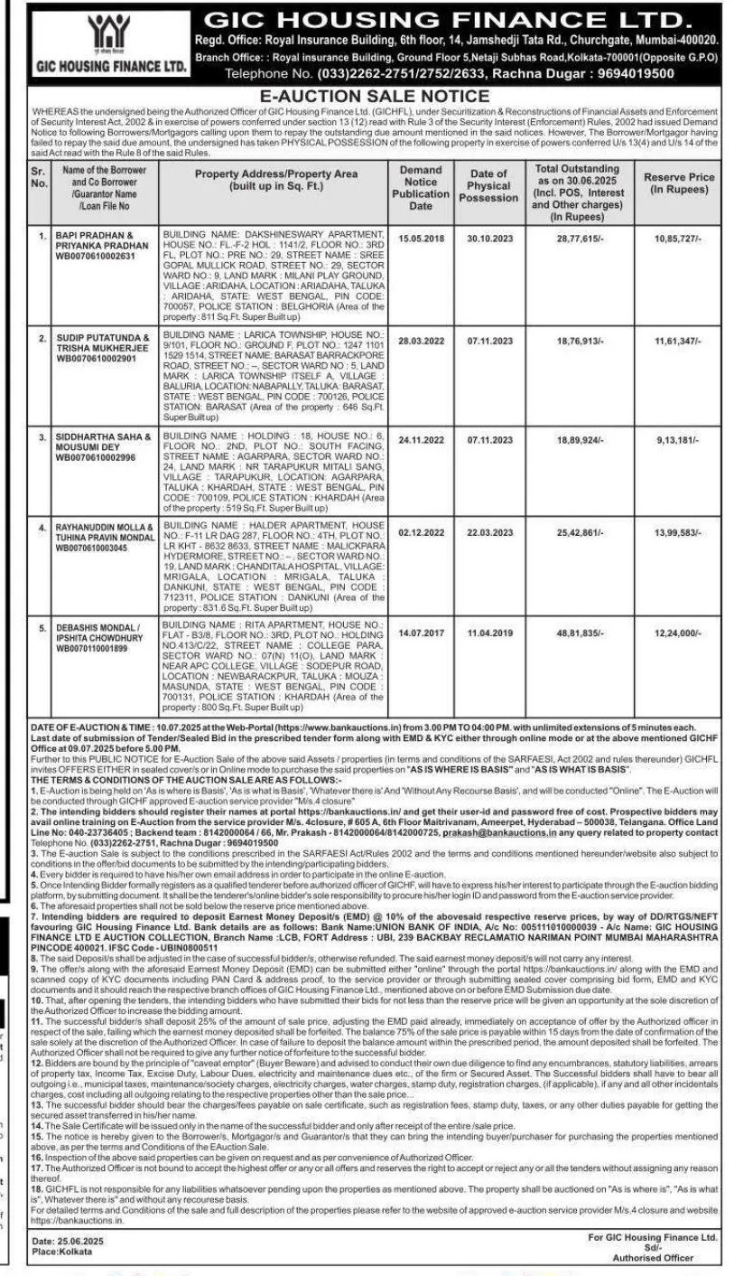 | Contact Details: | Contact The Authorized Officer : Rachna Dugar 9694019500,(033)22622751/2752/2633. |
