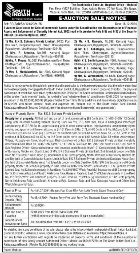 | Contact Details: | Contact the Authorized Officer : Mobile No :9894647220 or The South Indian Bank Ltd. Rajapalayam Branch, Mobile No.8075045551. |