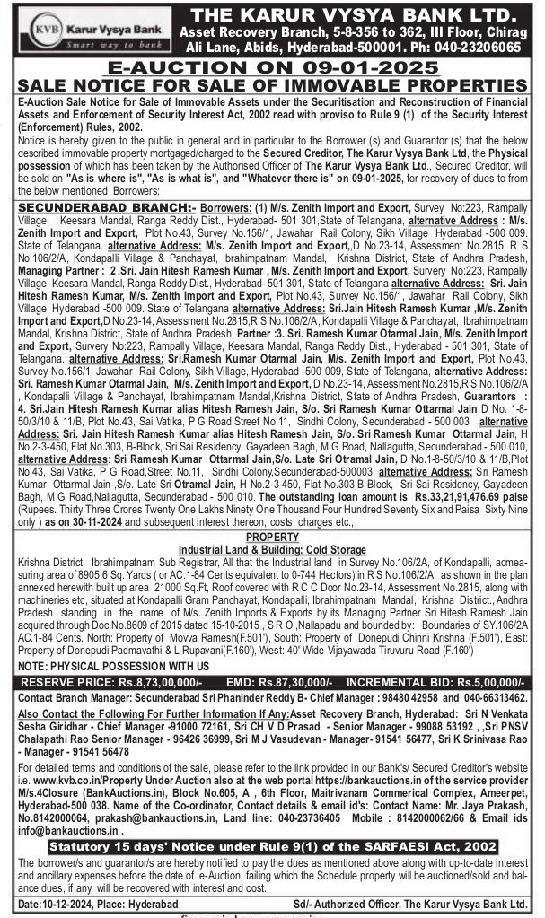 | Contact Details: | Contact The Authorized Officer: Sri B Phaninder Reddy B 9848042958, 040-66313462, SRI N VENKATA SESHA GIRIDHAR 9100072161, SRI CH V D PRASAD 9908853192, SRI PNSV CHALAPATHI RAO 9642636999, SRI M J VASUDEVAN 91541 56477, SRI K SRINIVASA RAO 9154156478 |